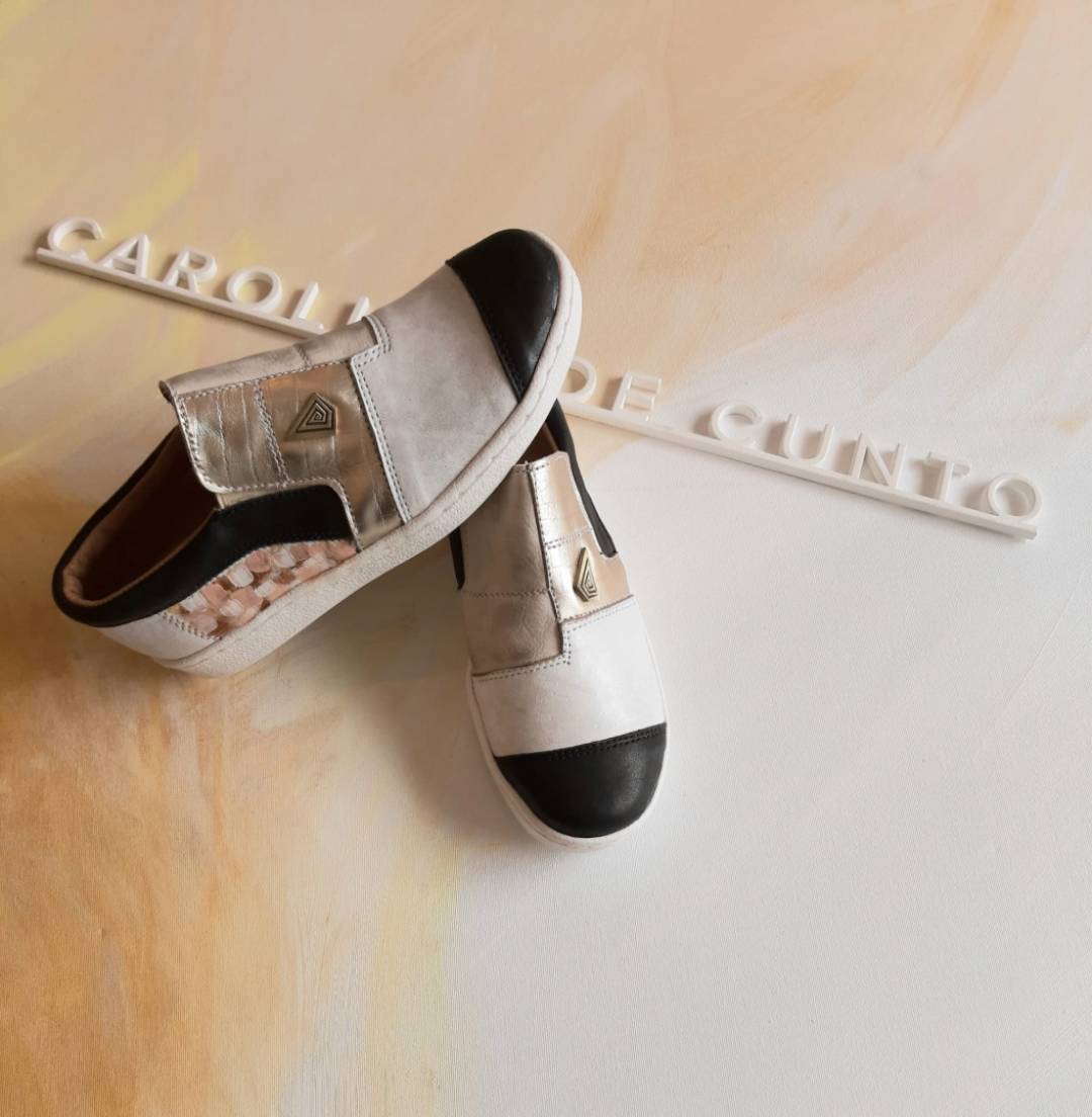 Calzado de cuero color blanco, dorado. Con detalle de arte pintado a mano.
