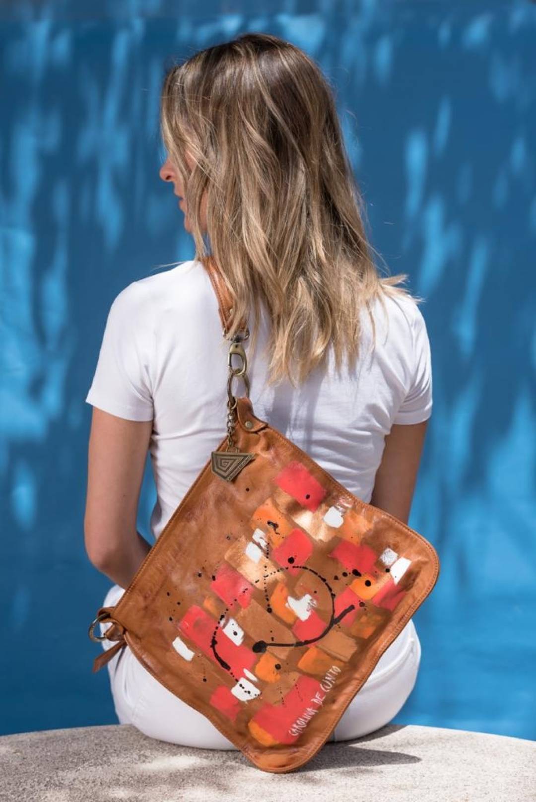 Originalidad y belleza. Cartera bandolera de forma levemente cuadrada y detalle de arte hecho a mano por Carolina. Tiene correa ajustable para usar al hombro o como bandolera. Su interior esta forrado de tela imprimé diseñada por Carolina. Cartera-bandolera hecha a mano con cueros uruguayos seleccionados de calidad superior.