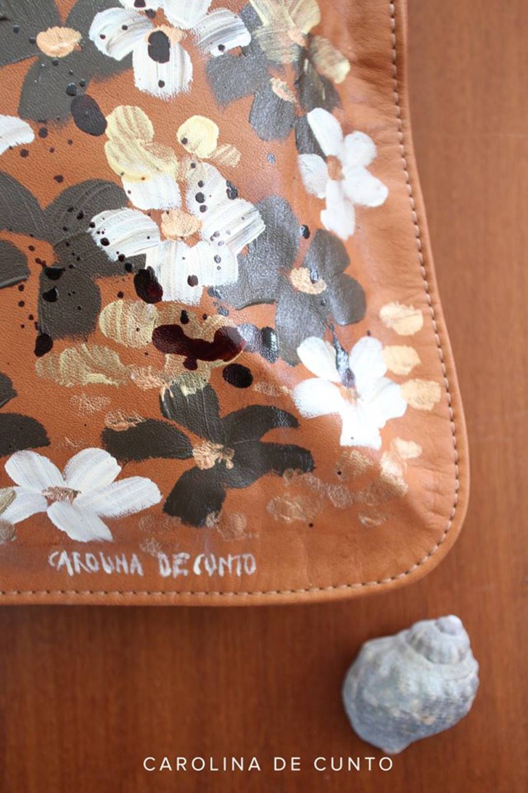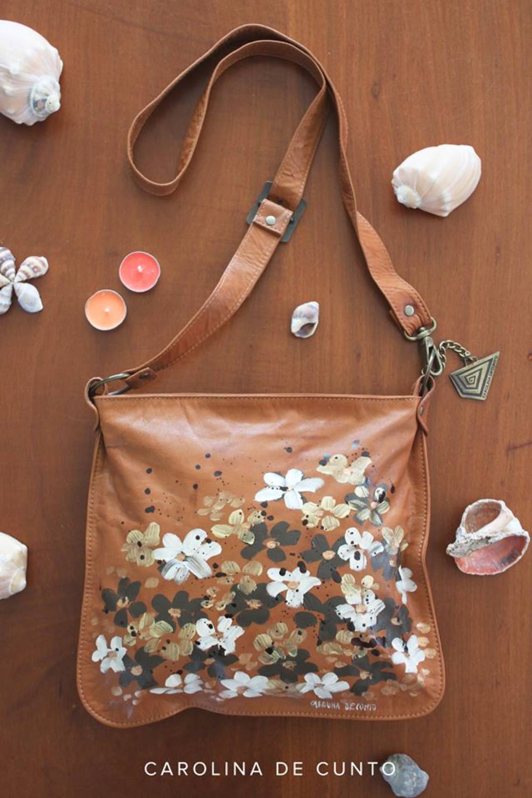 - Color: Cuero Terra con arte de flores hecho a mano.