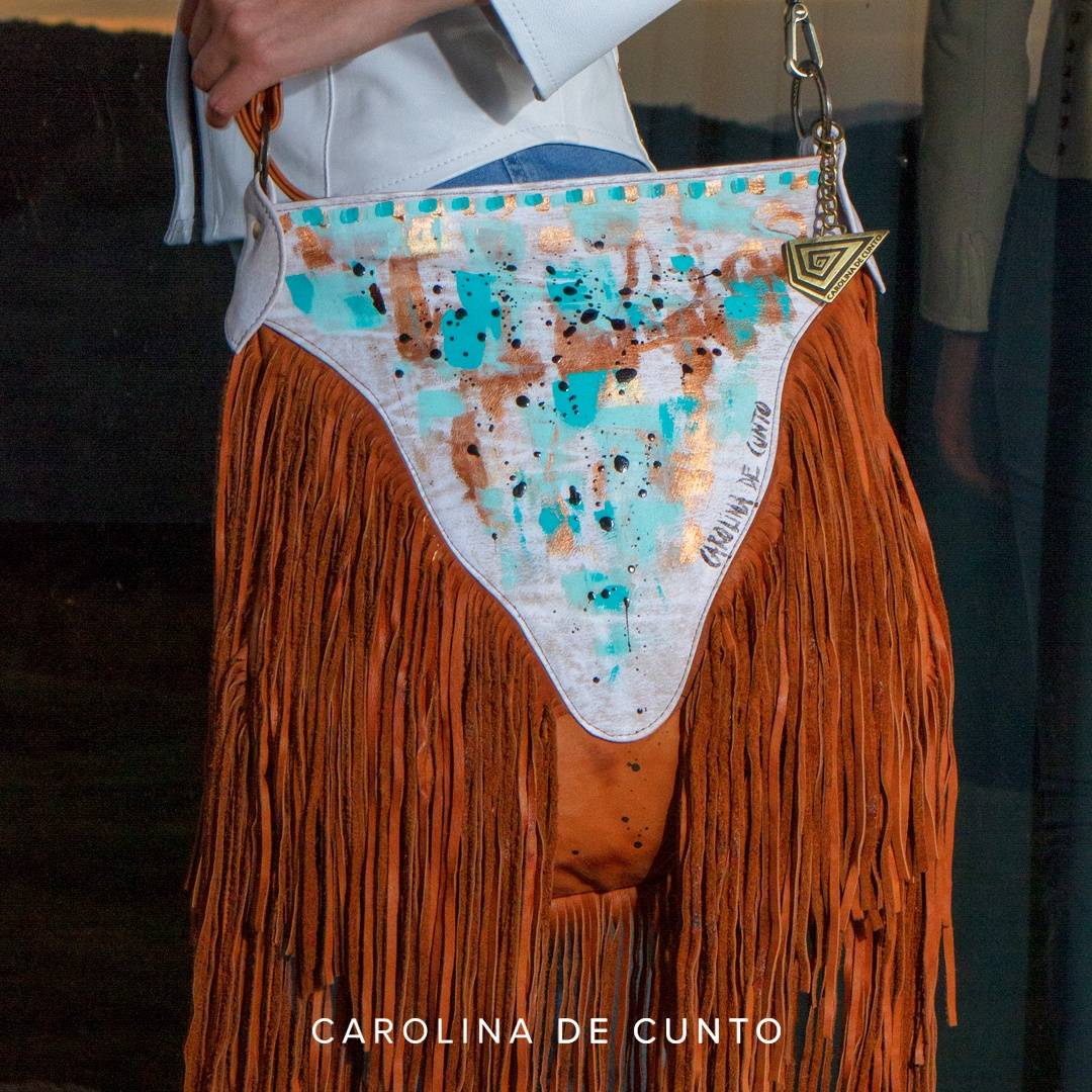 Arte para lucir. Movimiento y belleza. Cartera en cuero, colores vibrantes, de forma de redondeada, con prominentes flecos. Arte pintado a mano. Correa ajustable para usar al hombro o como bandolera. Su interior esta forrado de tela imprimé diseñada por Carolina. Cartera-bandolera hecha a mano con cueros uruguayos seleccionados de calidad superior.