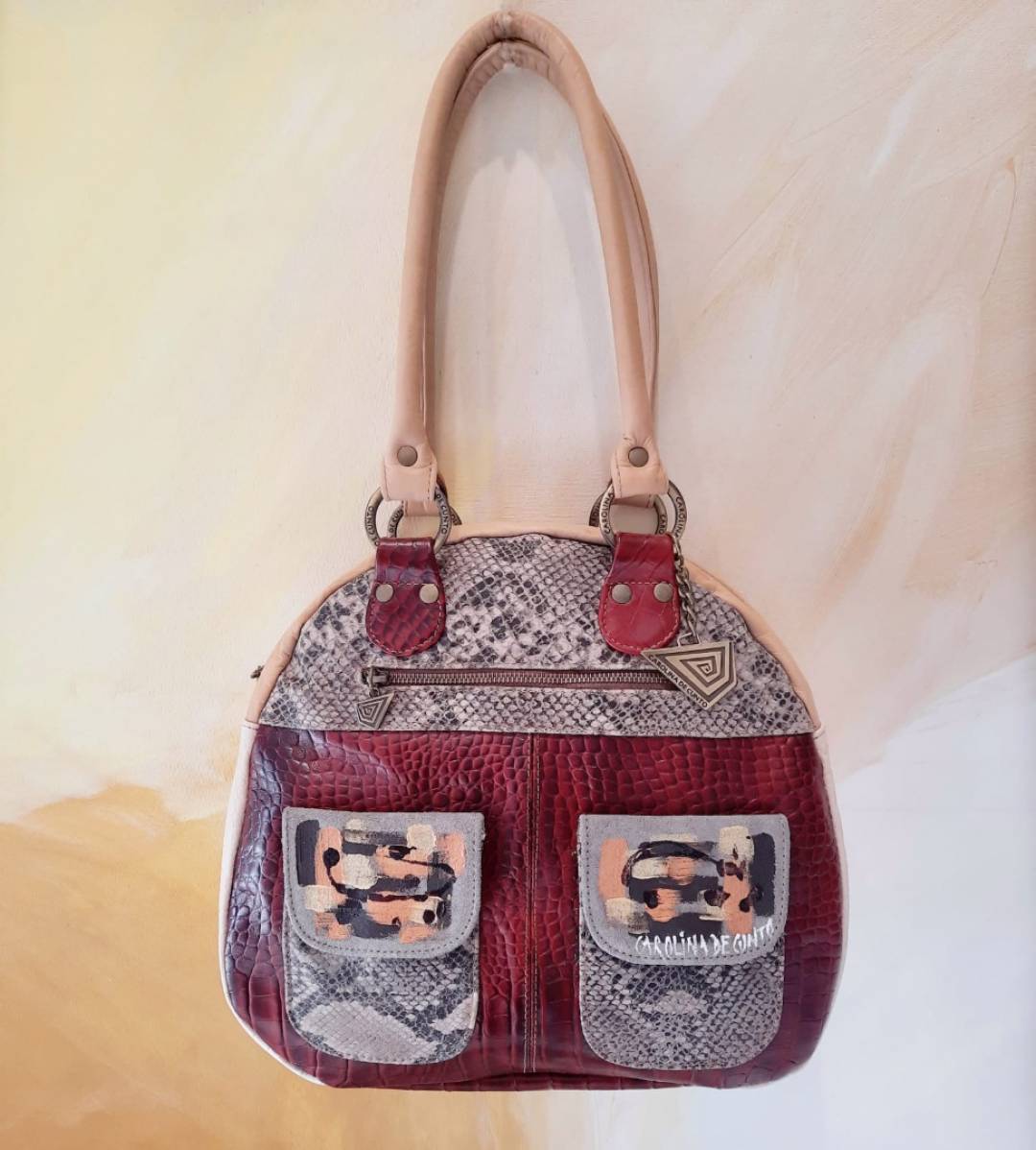 Práctica y elegante cartera de cuero suave, de formas redondeas con varios bolsillos de distintos tamaños. Cartera muy espaciosa, con mango fijo para usar al hombro. Su interior esta forrado de tela imprimé diseñada por Carolina. Cartera hecha a mano con cueros uruguayos seleccionados de calidad superior.