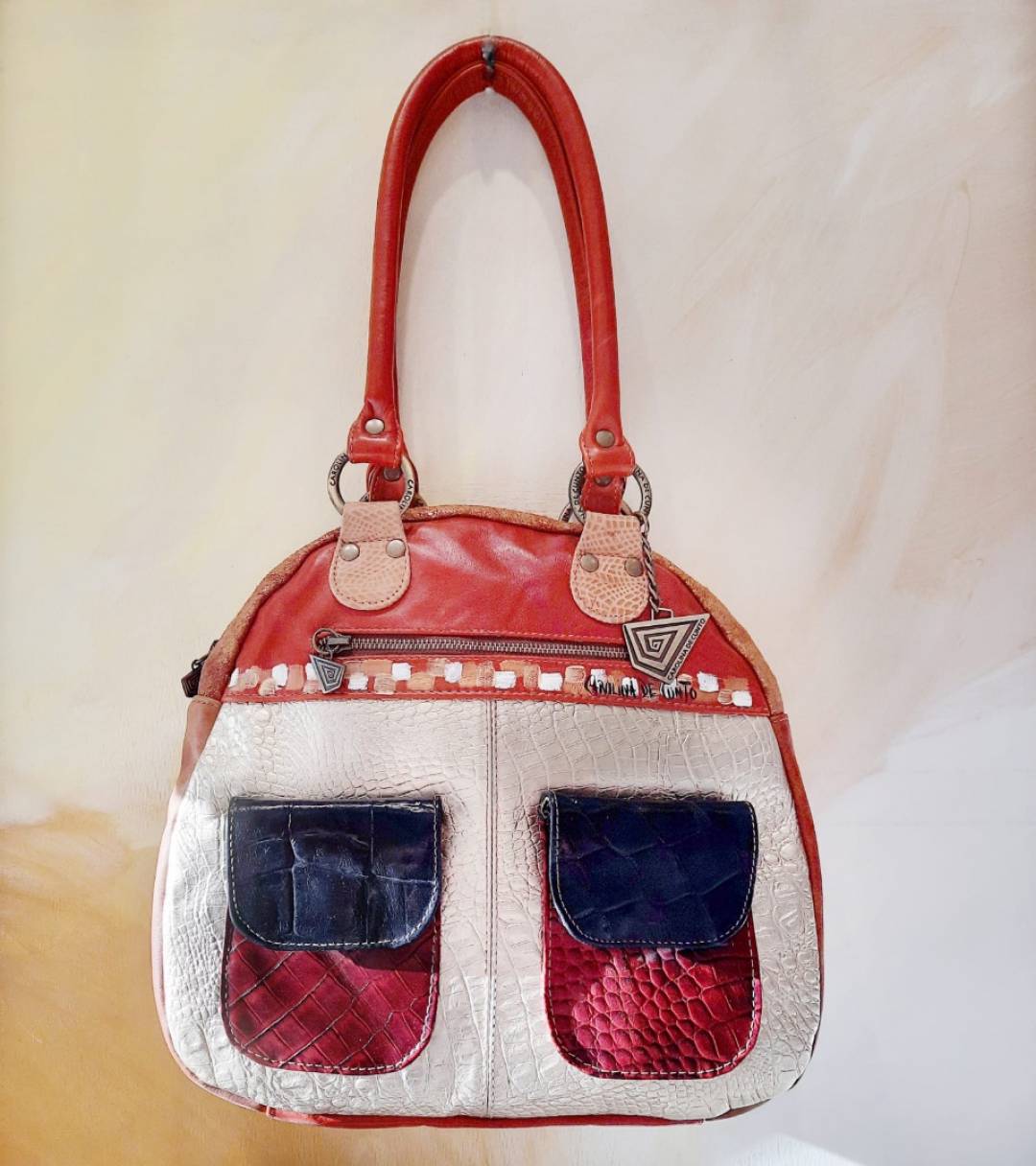 Práctica y colorida cartera de cueros combinados, de formas redondeas con varios bolsillos de distintos tamaños. Cartera muy espaciosa, con mango fijo para usar al hombro. Su interior esta forrado de tela imprimé diseñada por Carolina. Cartera hecha a mano con cueros uruguayos seleccionados de calidad superior.