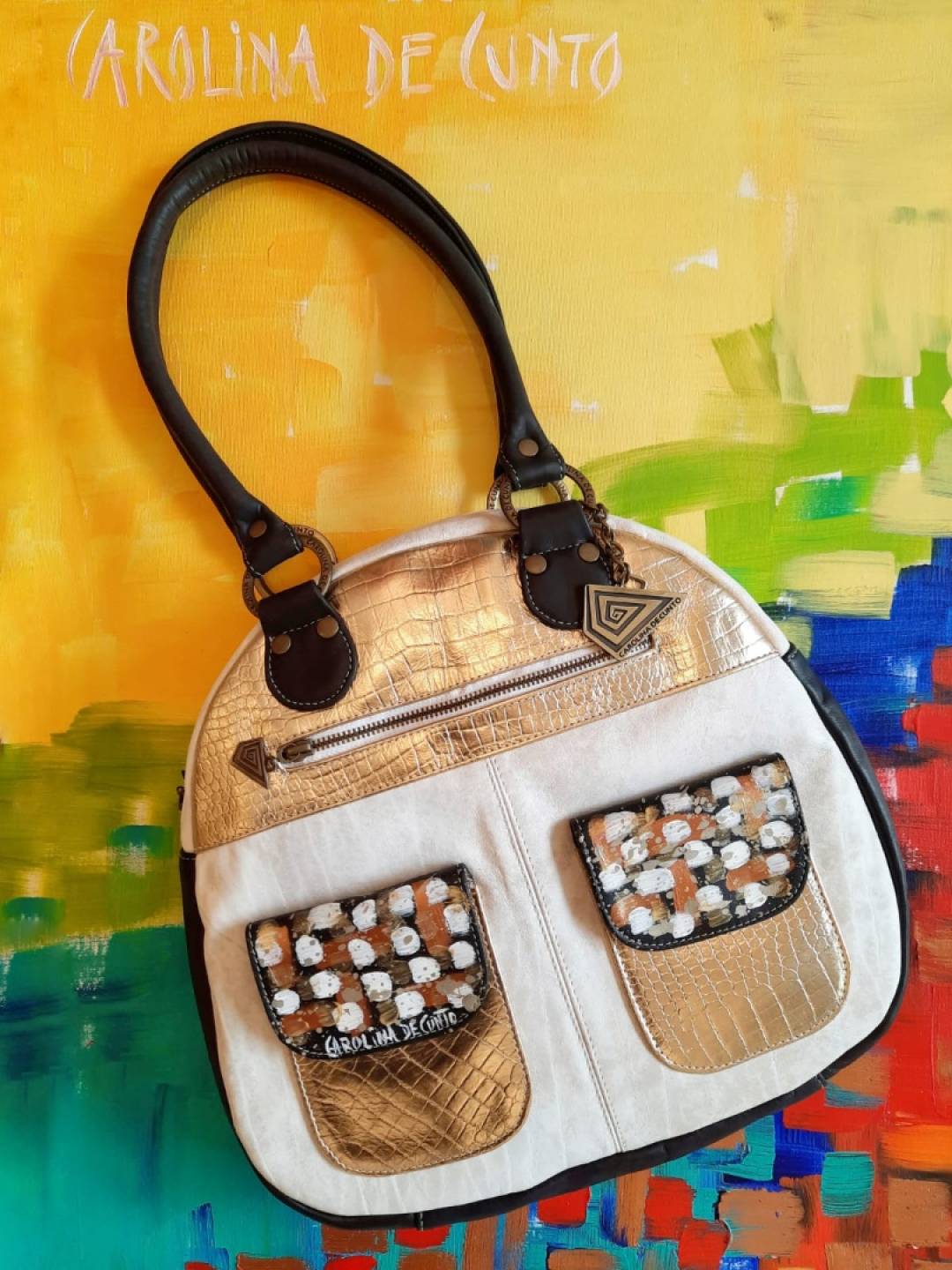 Práctica y elegante cartera de cuero suave, de formas redondeas con varios bolsillos de distintos tamaños. Cartera muy espaciosa, con mango fijo para usar al hombro. Su interior esta forrado de tela imprimé diseñada por Carolina. Cartera hecha a mano con cueros uruguayos seleccionados de calidad superior.