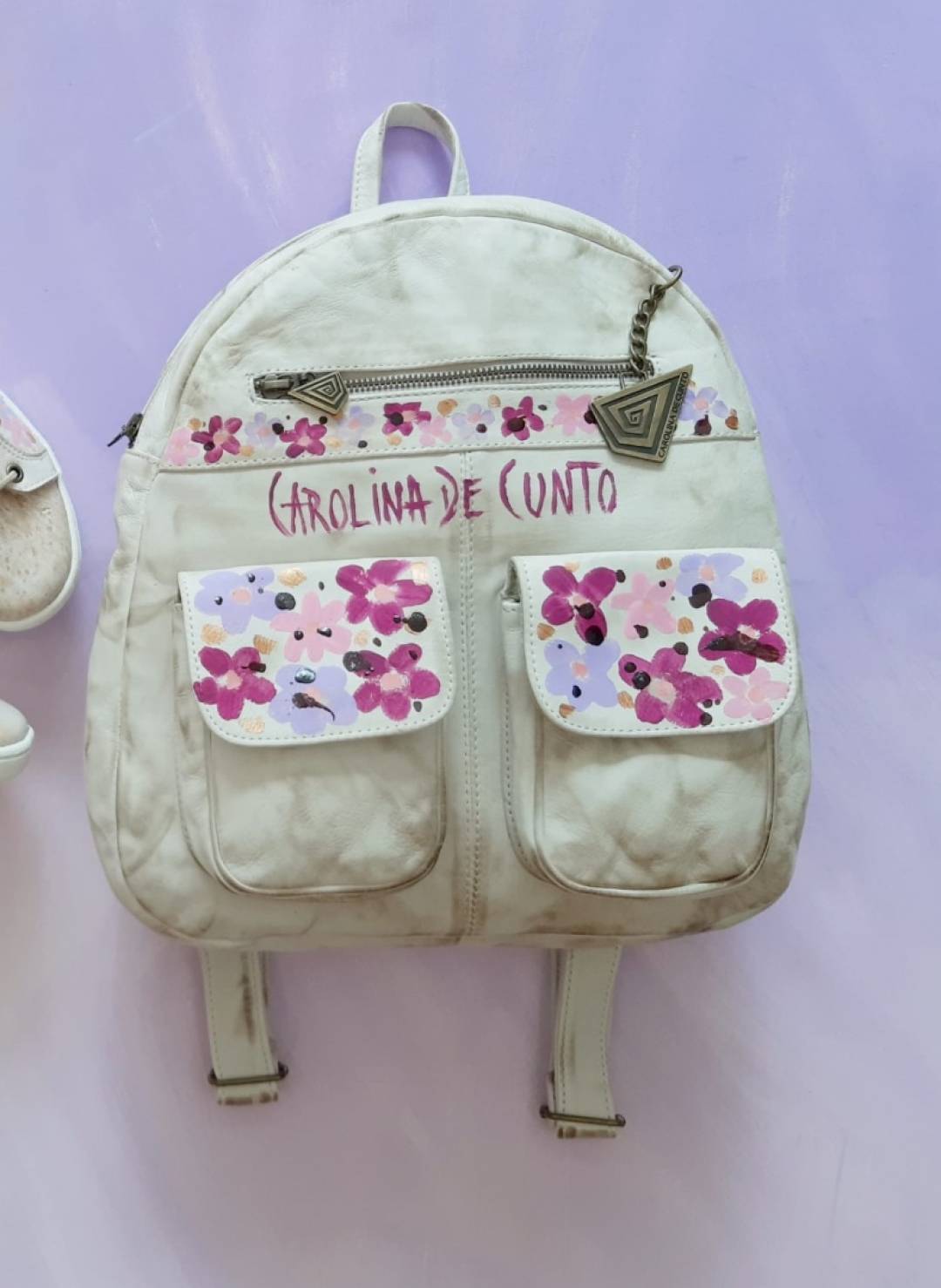 Mochila de cuero extra suave, práctica y cómoda. El color terra y el arte la destacan por el diseño, el detalle de arte en los bolsillos da un toque de distincion. Su interior está forrado de tela imprimé diseñada por Carolina. Mochila de piel hecha a mano con cueros uruguayos seleccionados de calidad superior.