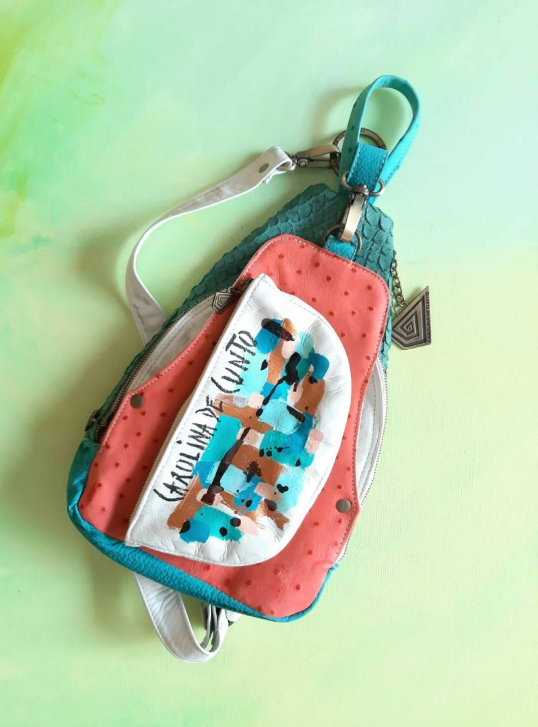 Una cartera cómoda, con un bolsillo frontal y cueros combinados a juego. Arte hecho a mano por Carolina De Cunto.