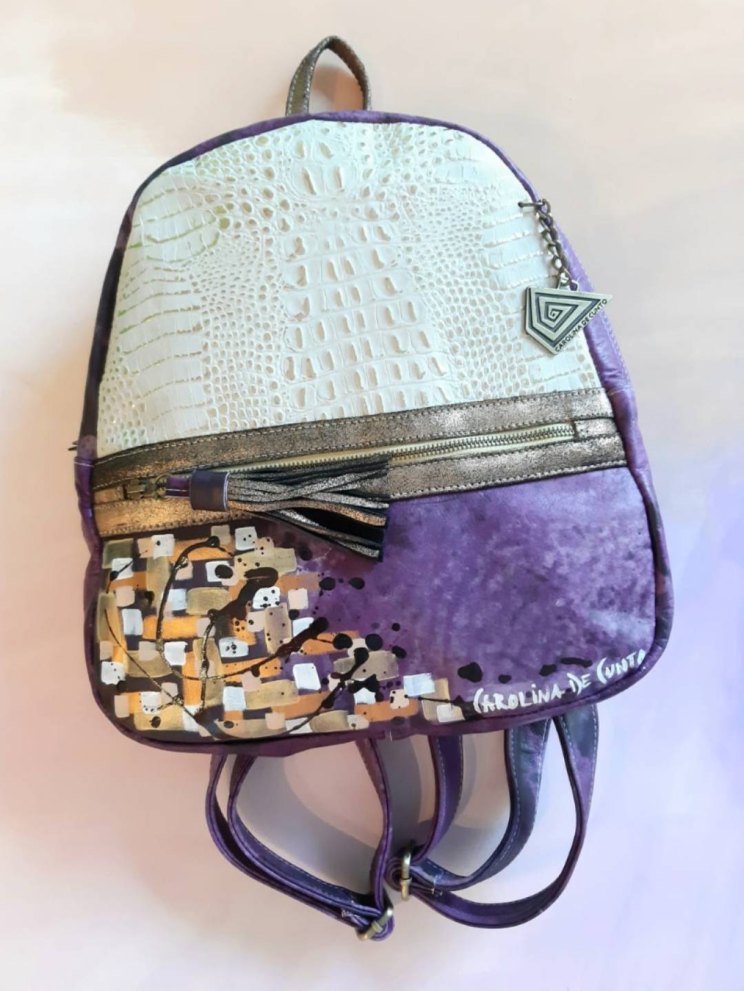 El sello de Carolina De Cunto hecho en metal es nuestra marca que respalda la calidad de una cartera hecha a mano en Uruguay.