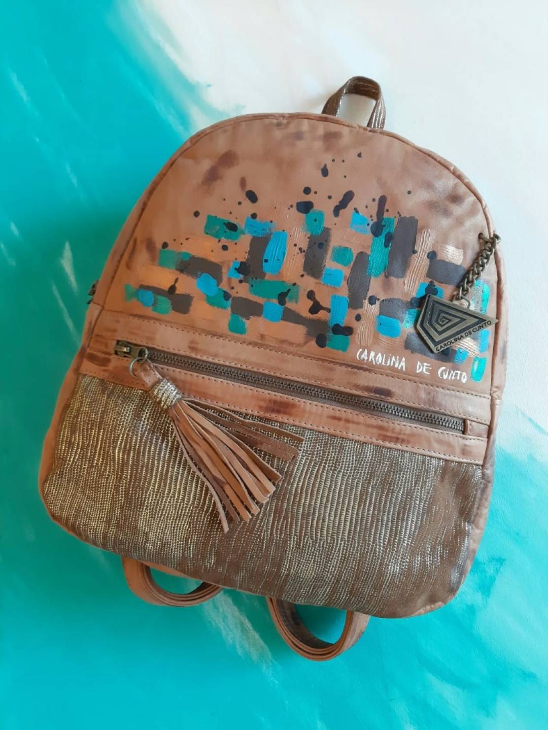 Una cartera cómoda, con un bolsillo frontal y cueros combinados a juego. Arte hecho a mano por Carolina De Cunto.