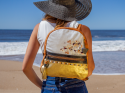 Elegante y practica cartera - mochila de cuero de gran capacidad, versatil y elegante. Diseño y combinación de cueros y texturas. Su interior esta forrado de tela imprimé diseñada por Carolina. Cartera hecha a mano con cueros uruguayos seleccionados de calidad superior. Borla de flecos largos en el cierre.