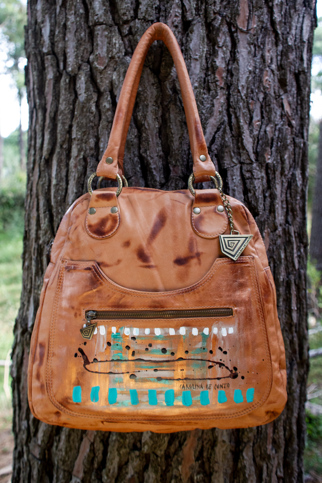 - Color: Cuero terracota. Detalle de arte pintado a mano en el frente.