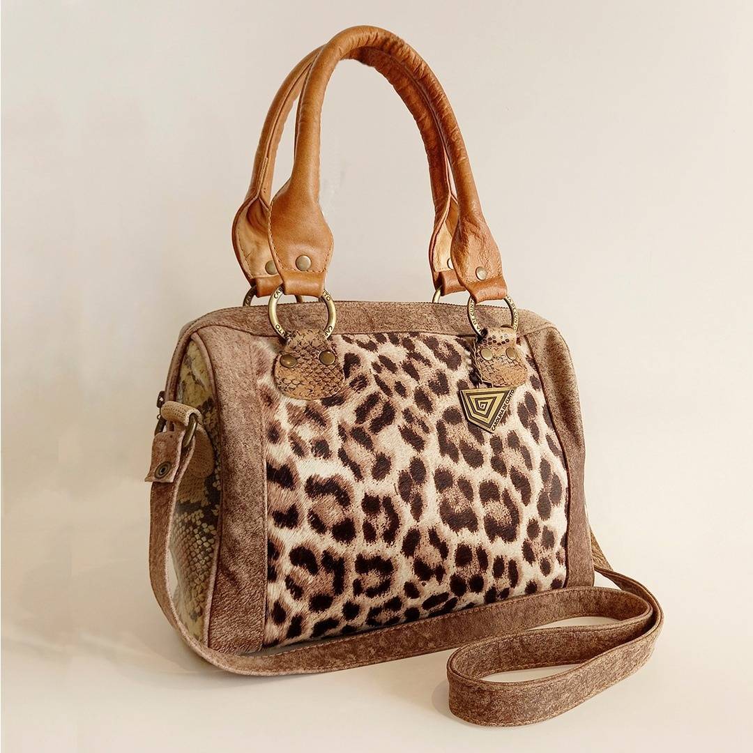 Práctica y elegante bolsa de piel en diseño animal print, en cuero con pelo corto en diseño leopardo, detalle de arte en el cuero.