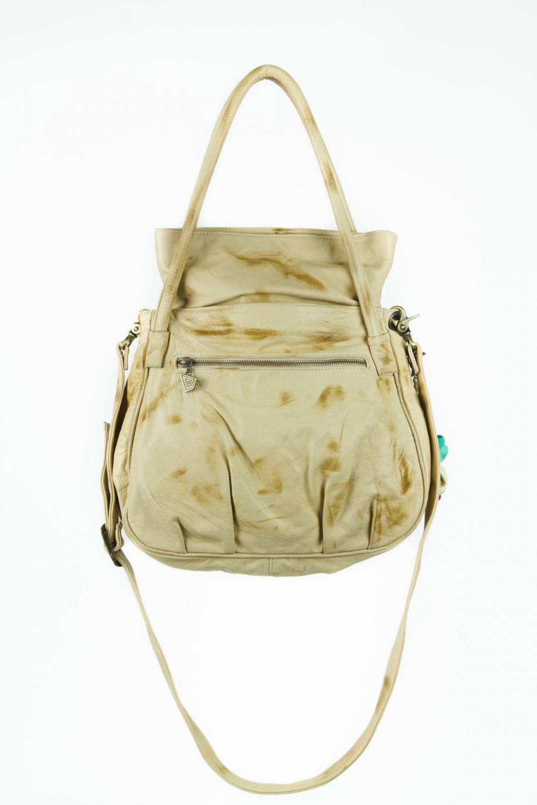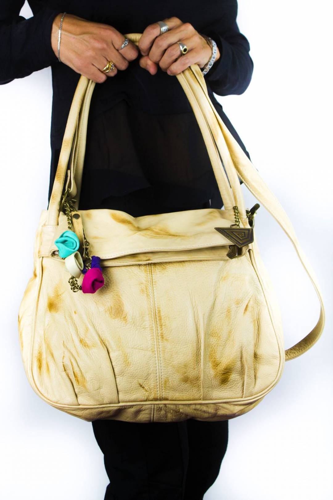 - Color: Suave cuero vacuno color marfil con pátina marrón. Borla de flores en colores.
