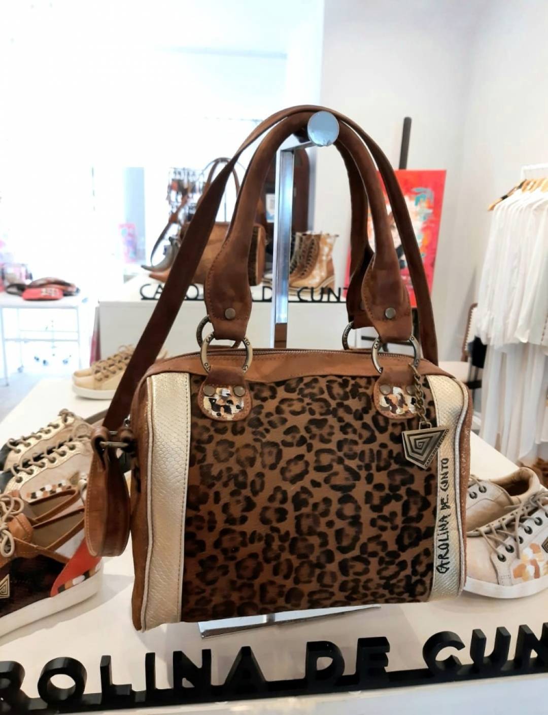 - Color: Suave cuero vacuno color marrón, dorado, cuero animal print, detalle de arte pintado a mano por Carolina.