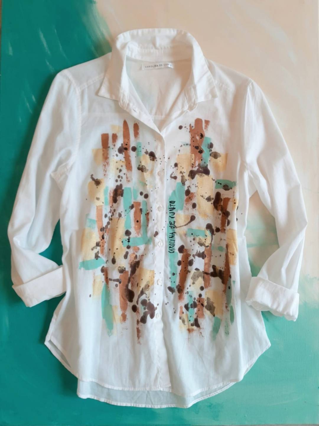 Arte para lucir. Camisa con arte hecho a mano por Carolina De Cunto. Jovialidad y estilo en una prenda.