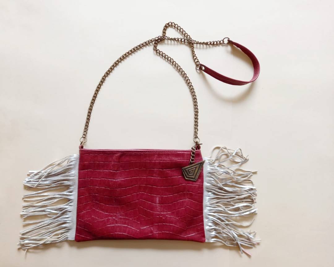 Elegante sobre de mano en cuero planteado brillante y detalle de arte pintado a mano por Carolina. Sobre de lineas suaves, flecos y tamaño perfecto. Para usar en mano o con cadena al hombro. Forrado con tela imprimé y bolsillo interior.