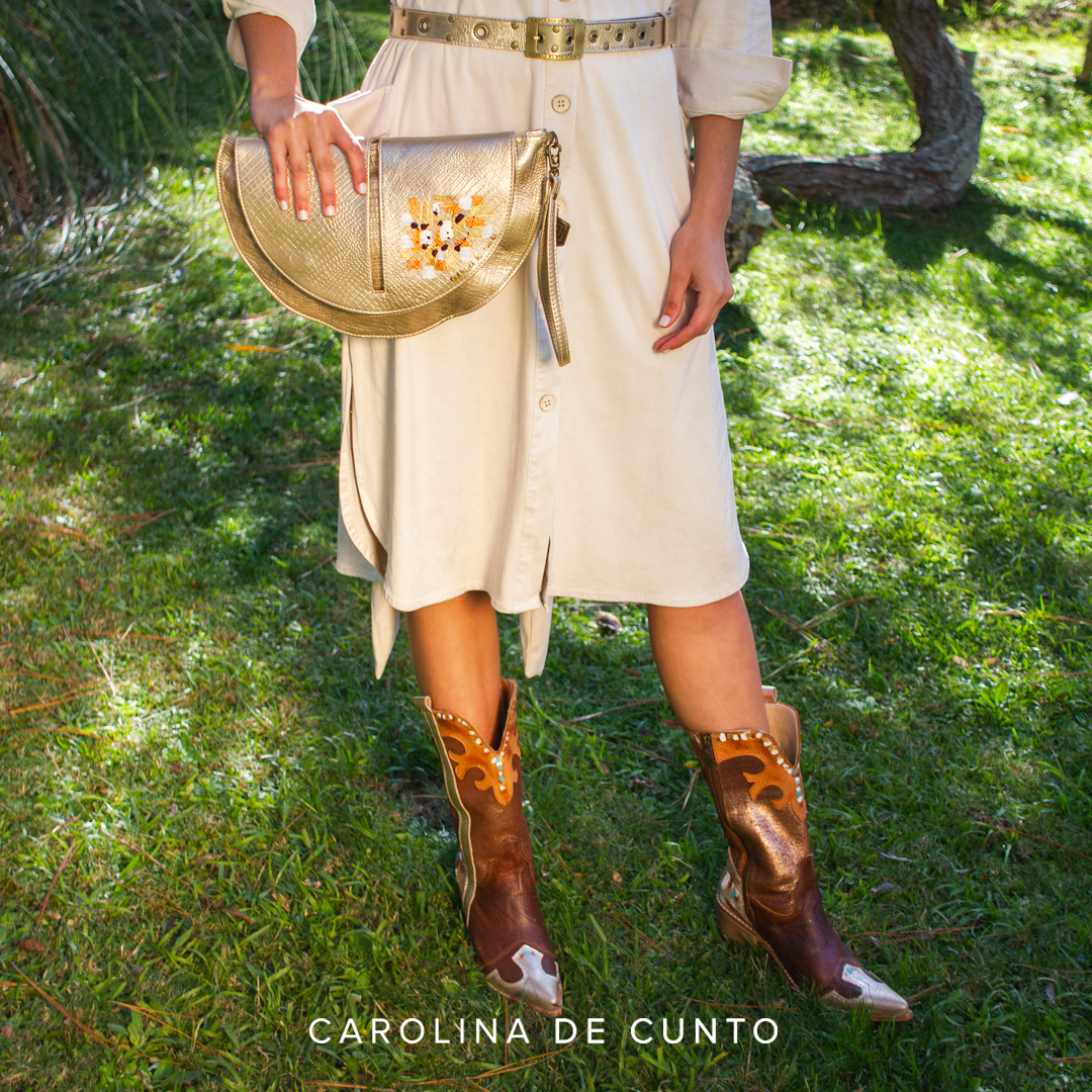 - Color: Cuero dorado. Detalle de arte pintado a mano por Carolina.