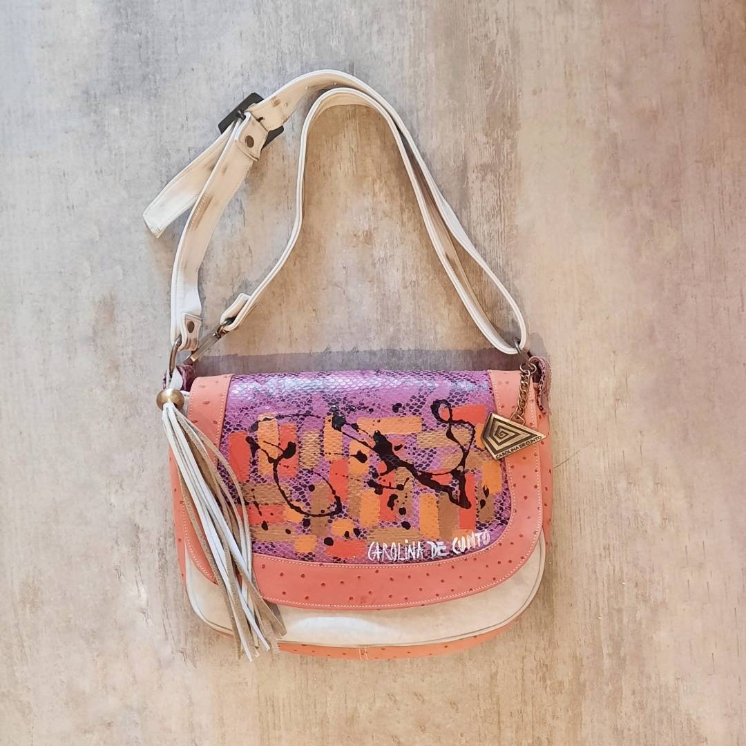 This is a juvenile, stylished leather cross-body bag , great combination of style, colors and textures. This is art to wear: hand painted art design detail in front accompany of calfskin hair-on in shiny colors, a one of the kind bag to impact. Wear it casual as a cross-body or short by the waist. Detail of hand painted art. Fully lined with with Carolina's design pattern fabric.This is 100 % finished top quality, handmade selected bovine leather.