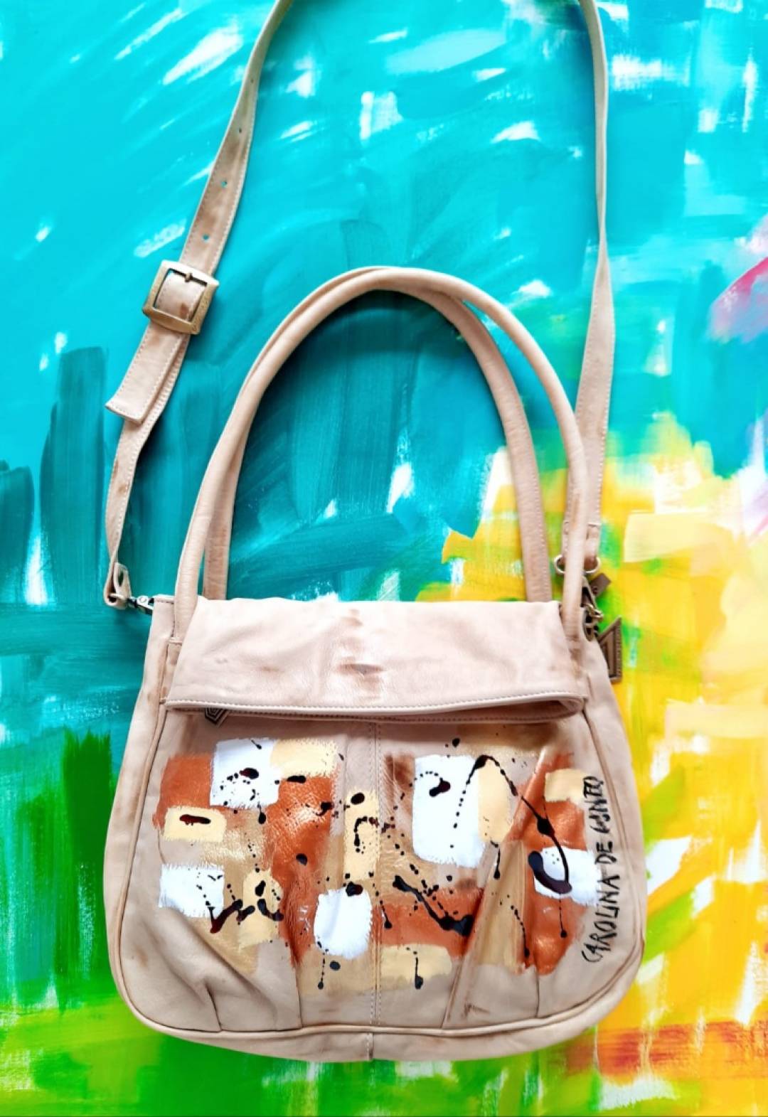 Simplicidad, practicidad y belleza. Cartera de suave cuero de formas redondeadas con fuelle y doblez en la parte superior lo que le permite expandir el espacio.Tiene doble uso, mangos cortos para usar al hombro y correa ajustable para uso como bandolera. Detalle de flores pintadas a mano por Carolina. Su interior esta forrado de tela imprimé diseñada por Carolina. Viene con una borla decorativa con flores de cuero de colores. Cartera-bandolera hecha a mano con cueros uruguayos seleccionados de calidad superior. ![]()