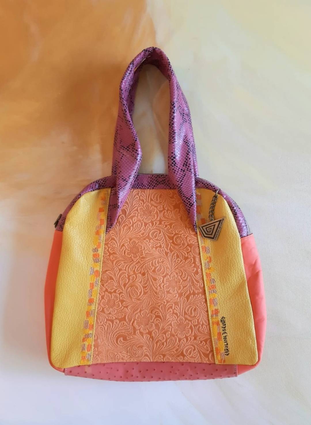Práctica y elegante bolsa de piel en colores vibrantes realizada en varios tipos de cueros: fantasía, imitación víbora y cuero nonato con pelo en diseño animal print. Cartera de cuero de tamaño mediano, con fuelle que le aporta buena capacidad para su tamaño. Correa corta fija para usar al hombro y correa larga para usar como bandolera. Su interior esta forrado de tela imprimè diseñada por Carolina. Viene con una borla decorativa con flecos largos y un pequeño símbolo de la paz. Cartera hecha a mano con cueros uruguayos seleccionados de calidad superior.