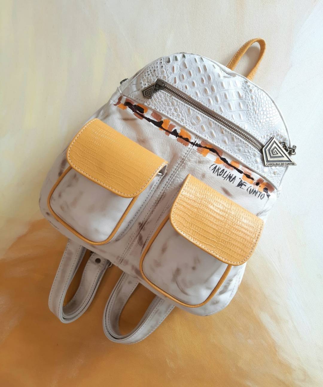 Don't miss this round design leather backpack in extra soft leather. Flap for pockets in the front gives this backpack elegant wear. Fully lined with Carolina's design pattern fabric. This leather backpack is 100 % finished top quality, handmade selected bovine leather.
