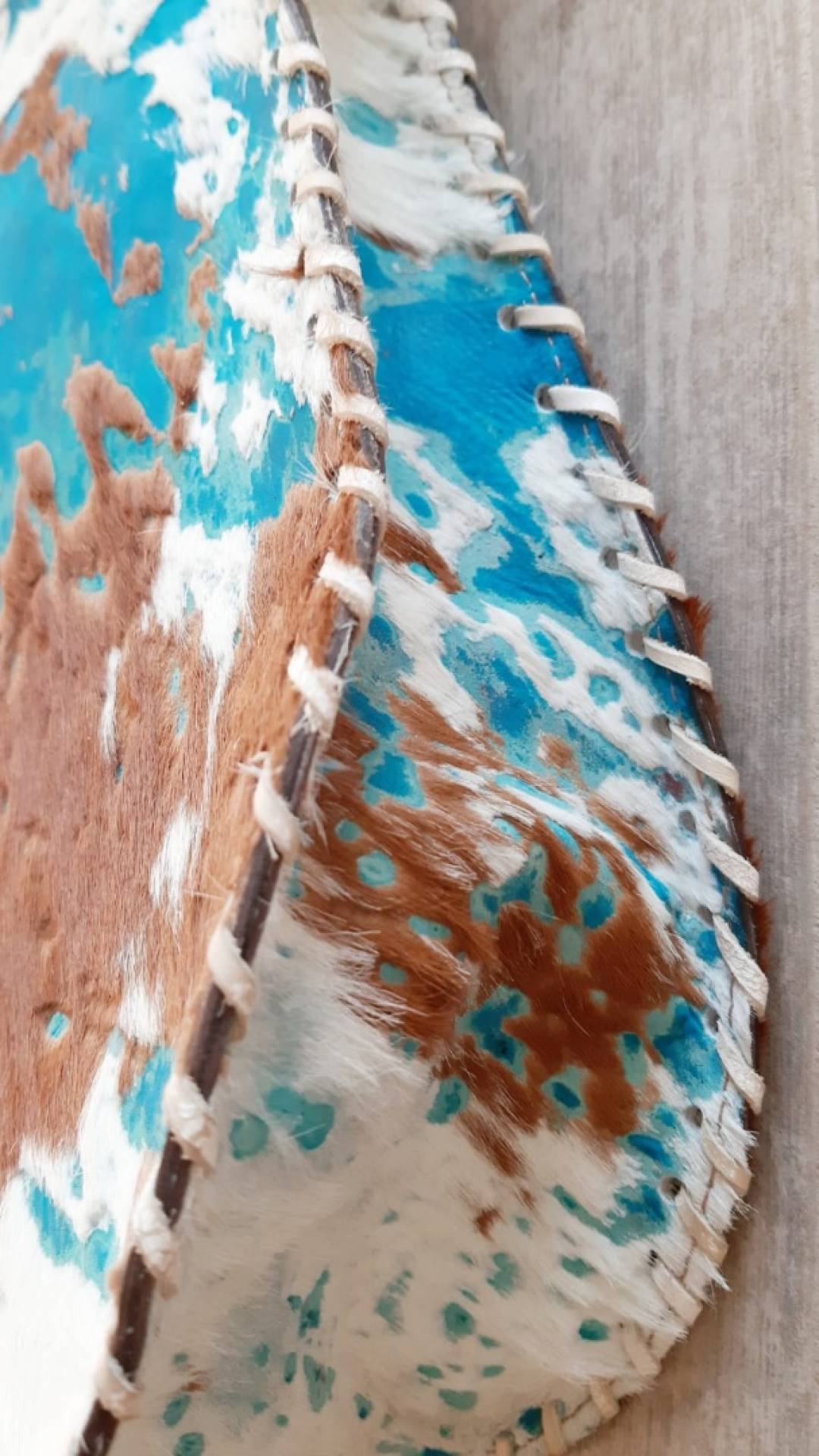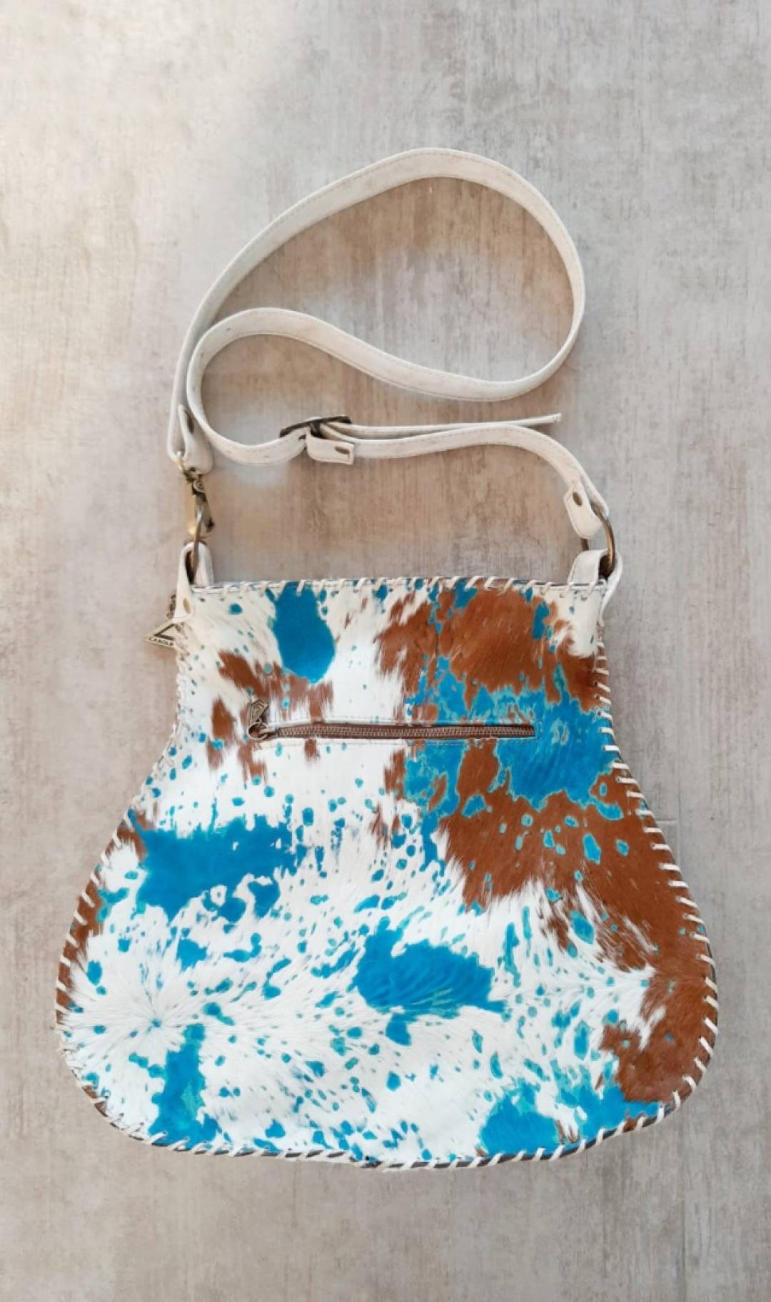 Elegancia y belleza. Cartera con contraste de colores. Tiene correa ajustable para usar al hombro o como bandolera. Su interior esta forrado de tela imprimé diseñada por Carolina. Cartera-bandolera hecha a mano con cueros uruguayos seleccionados de calidad superior.