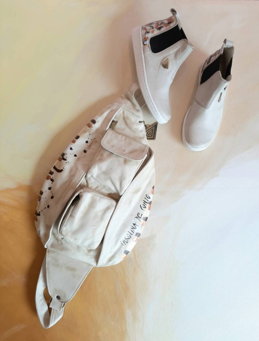 Practica bandolera de cuero dorado. Diseño exclusivo, combinación de cueros y texturas. Su interior esta forrado de tela imprimé diseñada por Carolina. Hecha a mano con cueros uruguayos seleccionados de calidad superior.