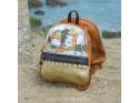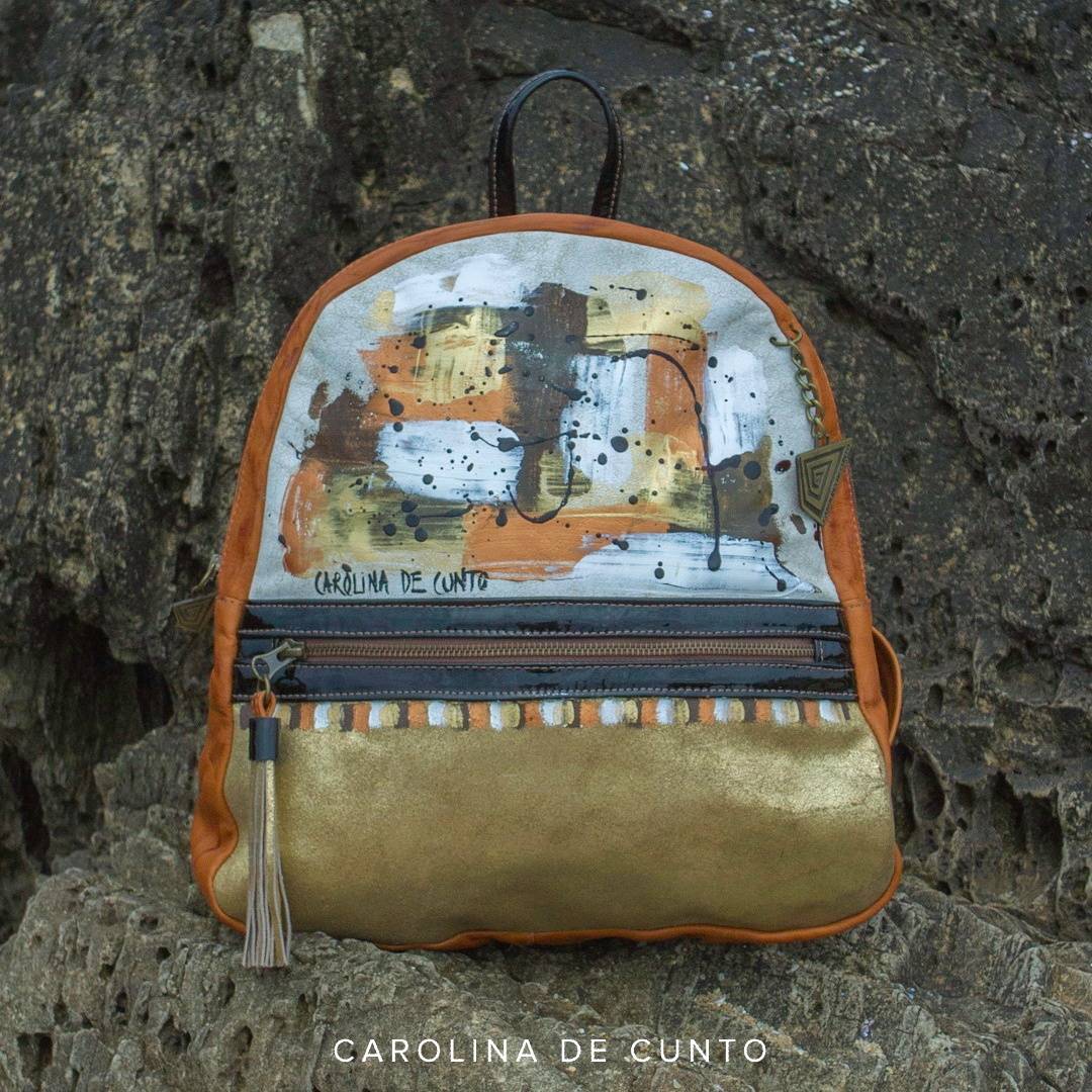 Elegant, extra soft leather backpack . Combination of leathers and textures. Don´t miss the chance to glow! Perfect size and practicity combined with design. Handpainted art on pockets. Fully lined with Carolina's designed pattern fabric. This is a 100 % finished top quality, handmade selected bovine leather.