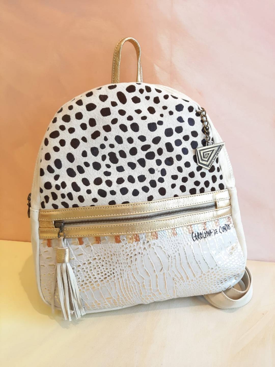 Elegante y practica cartera - mochila de cuero de gran capacidad, versatil y elegante. Su interior esta forrado de tela imprimé diseñada por Carolina. Cartera hecha a mano con cueros uruguayos seleccionados de calidad superior. Borla de flecos largos en el cierre.