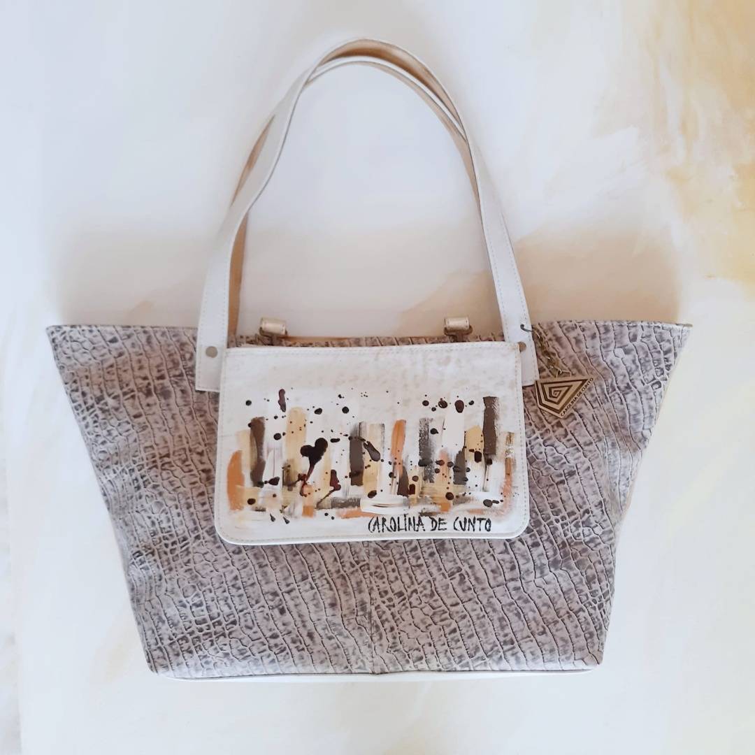 Práctica bolsa de piel, cartera de cuero realizada en combinación de texturas. Cartera muy espaciosa, con mangos fijos para usar al hombro. Admite 6 posibilidades de cartera en un solo modelo. Su interior esta forrado de tela imprimé diseñada por Carolina. Cartera hecha a mano con cueros uruguayos seleccionados de calidad superior.