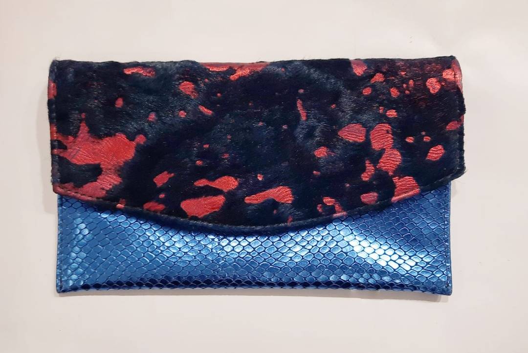 Check this simple lined, soft- shaped clutch for elegant formal or casual wear, hand size. Two compartments and one pocket inside.