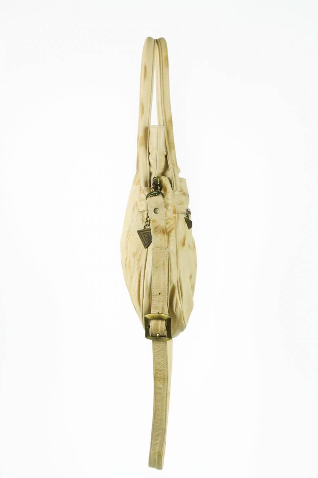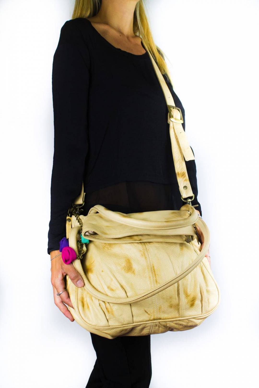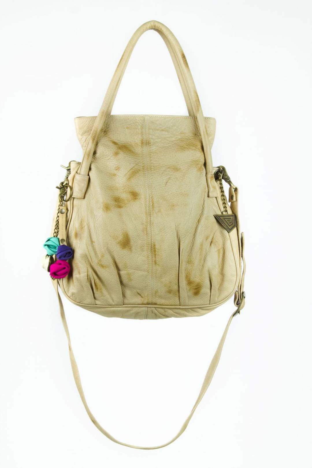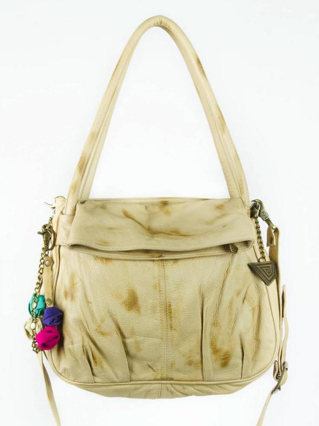 - Color: Suave cuero vacuno color marfil con pátina marrón. Borla de flores en colores.