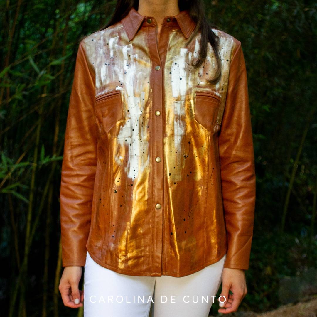 Art to wear. Elegant leather shirt in caramel color hand painted by Carolina de Cunto. Handmade with selected Uruguayan leathers of superior quality.