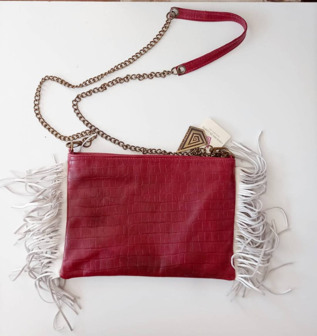 - Color: Fuchsia leather with art detail Hand painted by Carolina. Removable chain for hand or shoulder wear.