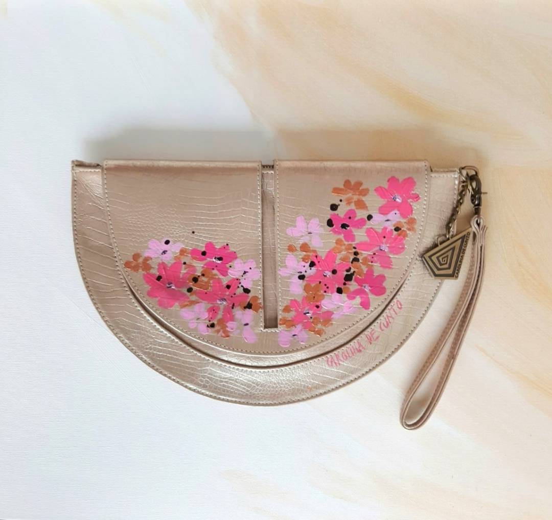 Check this elegnat and vibrant hand clutch for formal or casual wear. Gold textured leather, hand painted detail, painted by Carolina.