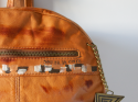 Don't miss this round design leather backpack in extra soft leather. Many pockets in different sizes. Flap for pockets in the front gives this backpack elegant wear. Fully lined with Carolina's design pattern fabric. Comes with a tassel with flowers in colors to match. This leather backpack is 100 % finished top quality, handmade selected bovine leather.